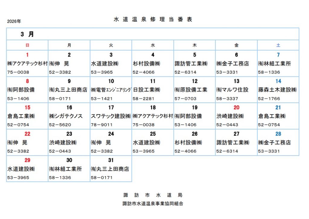 【諏訪市】令和8年3月の修理当番店 2026年3月1日 お知らせ by j 2月後半から花粉を感じる日がちらほら。暖かい日も続くようになり春の予感がしますね。今年は雪も少なく…と言っていると突然来るのが信州の怖いところ! 2025年3月の水道温泉修理当番店情報です。 詳しくは諏訪市のホームページよりご覧ください。 Share: